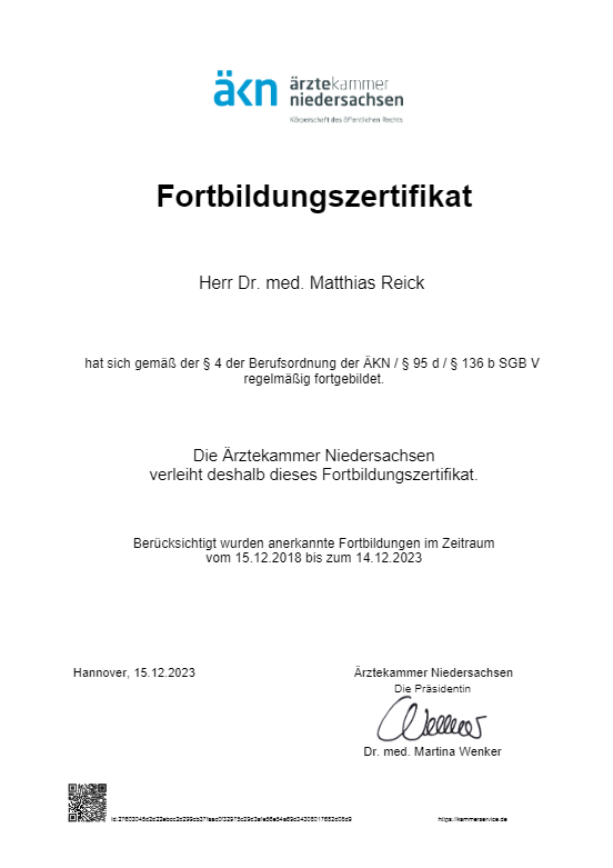 | seit 1997 | Niederlassung in eigener orthopädischer Praxis in Oyten in Praxisgemeinschaft mit den Hausärzten Dres. Reiß und Vehlies Zulassung zum Unfallarzt (H-Arzt) ambulante Operationen in der Tagesklinik Bremen | |